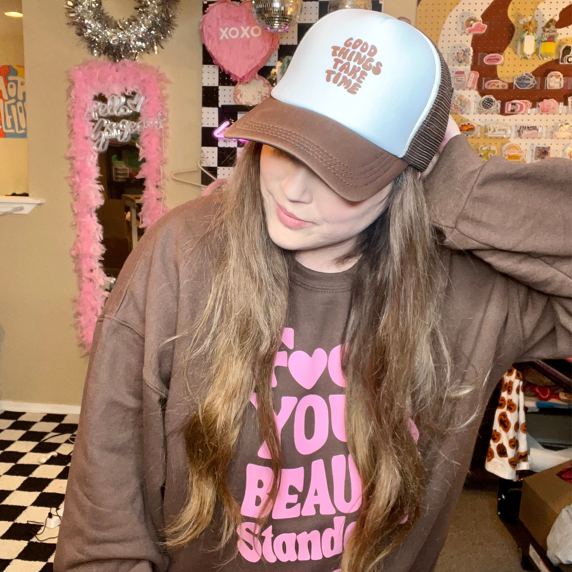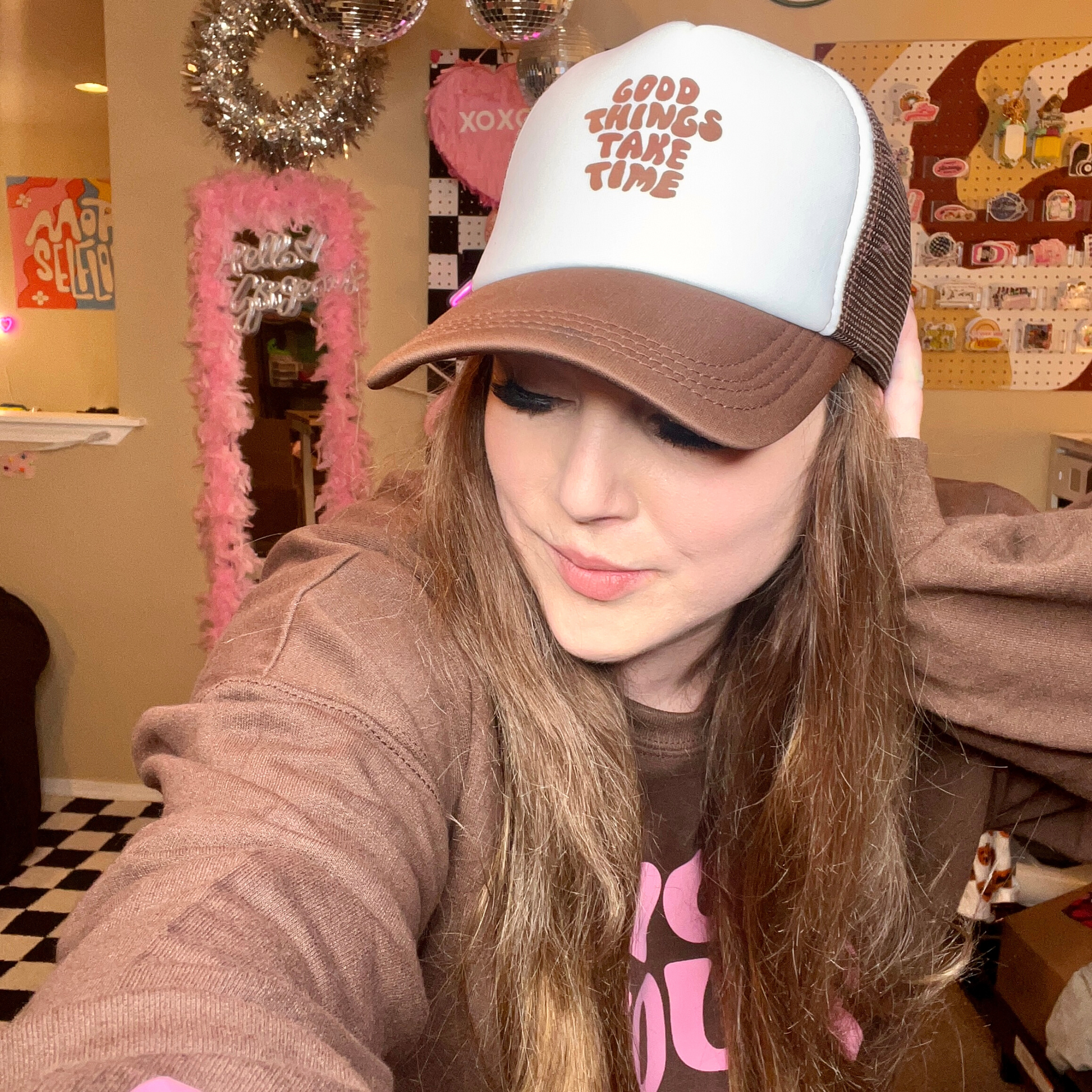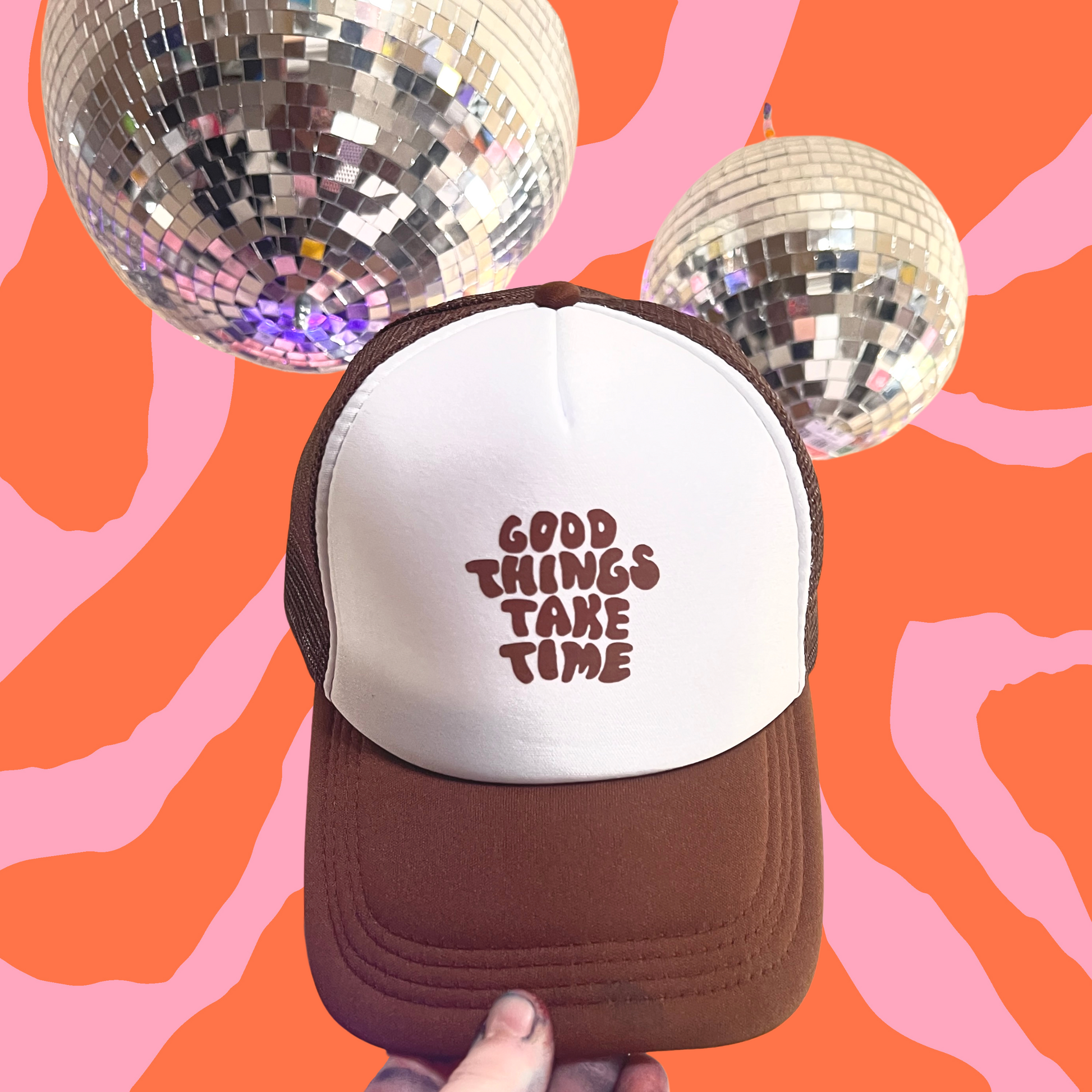 Good Things Take Time Brown Trucker Hat